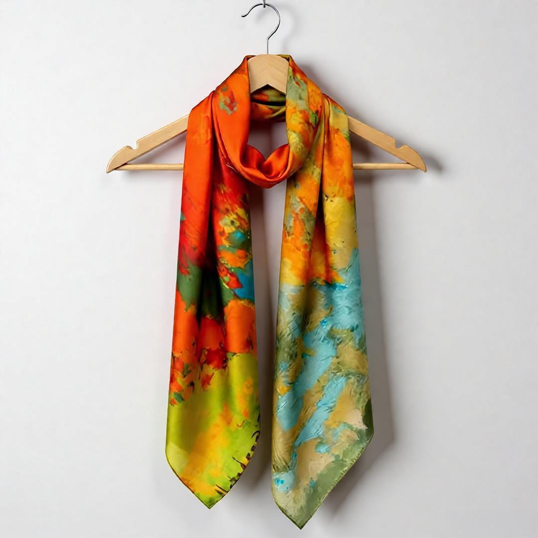 Smooth to the touch with a fluid finish, the Amber Dusk Silk Scarf delivers comfort and sophistication in equal measure. Whether styled around the neck, tied to a handbag, or worn as a headscarf, it brings effortless charm to everyday wear and special occasions alike.